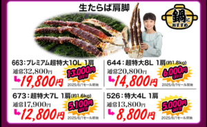 - サイズとボリューム:たとえば10L~8L級の「超特大生ずわい半むき身満足セット」など、迫力ある大きさの蟹を取り扱っており、満足度の高い食べ応え。